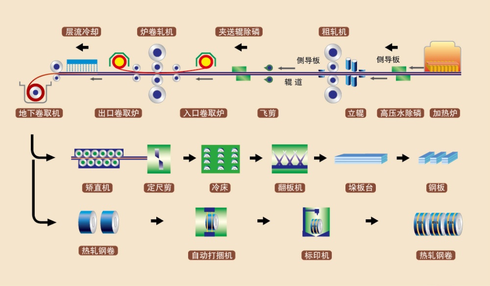 軋鋼分廠主要有步進式加熱爐,立輥軋機和四輥可逆式軋機等設備,可實現厚度3-16mm,寬度800-1600的卷軋制,最厚100mm,寬度1600mm中厚板的軋制。