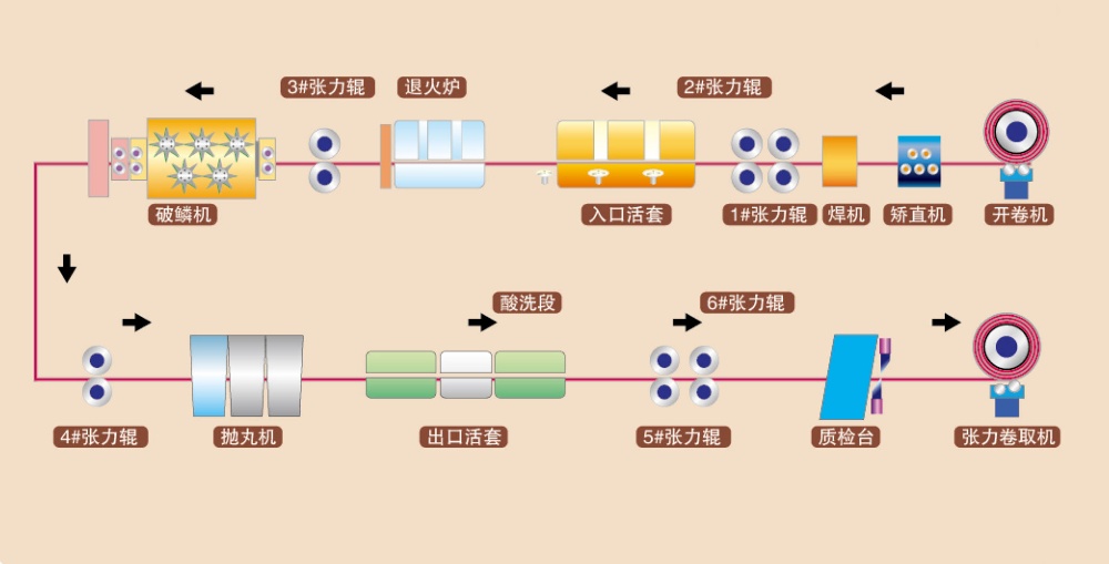 退洗分廠主要有臥式連續退火爐,破磷機,拋丸機,化學酸洗等設備,可實現奧氏體不銹鋼,鐵素體不銹鋼,雙相不銹鋼等多種類不銹鋼卷的連續退火酸洗。