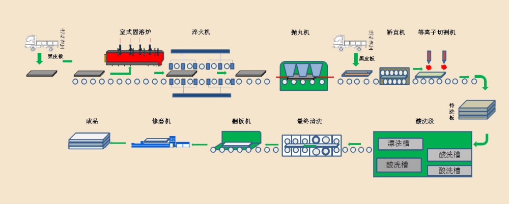 退火酸洗中板線主要有室式固熔爐,全自動中板淬火機組,拋丸機,矯直機,酸洗池等設備,可實現最寬3200mm,最厚90mm中板的退火酸洗。
